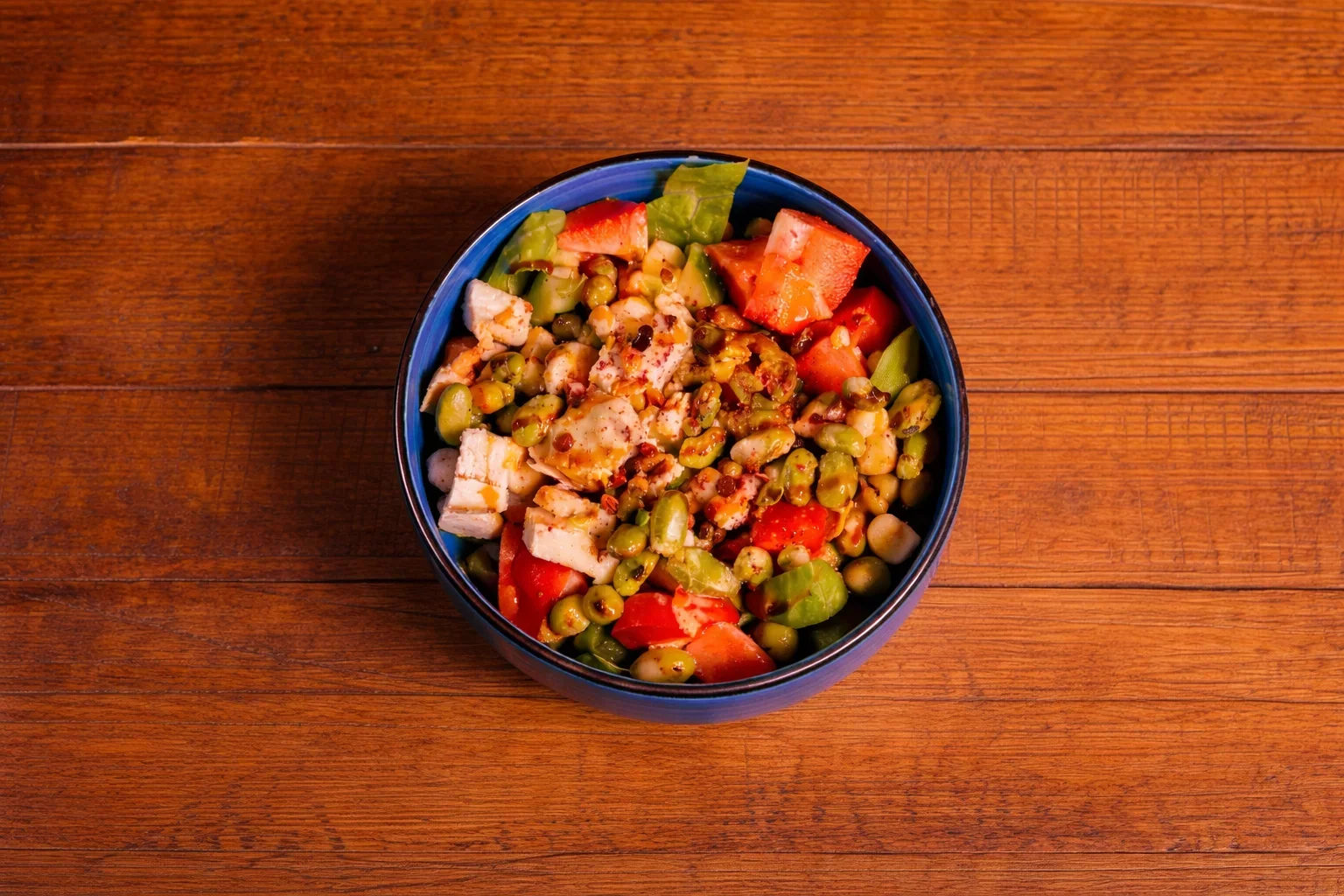 A mix of fresh greens, fiber-filled veggies, protein of choice and a vegetarian protein option, as well as a signature dressing. Gluten free, dairy free, and loads of satisfying flavor.